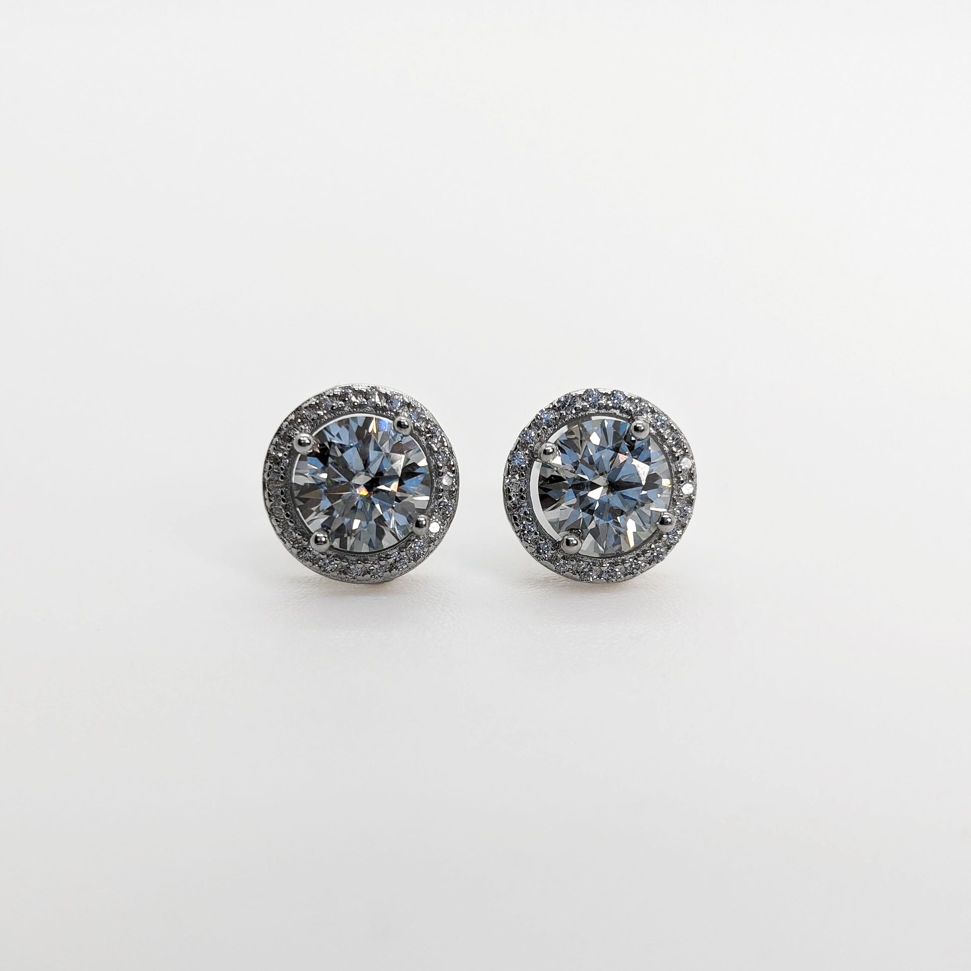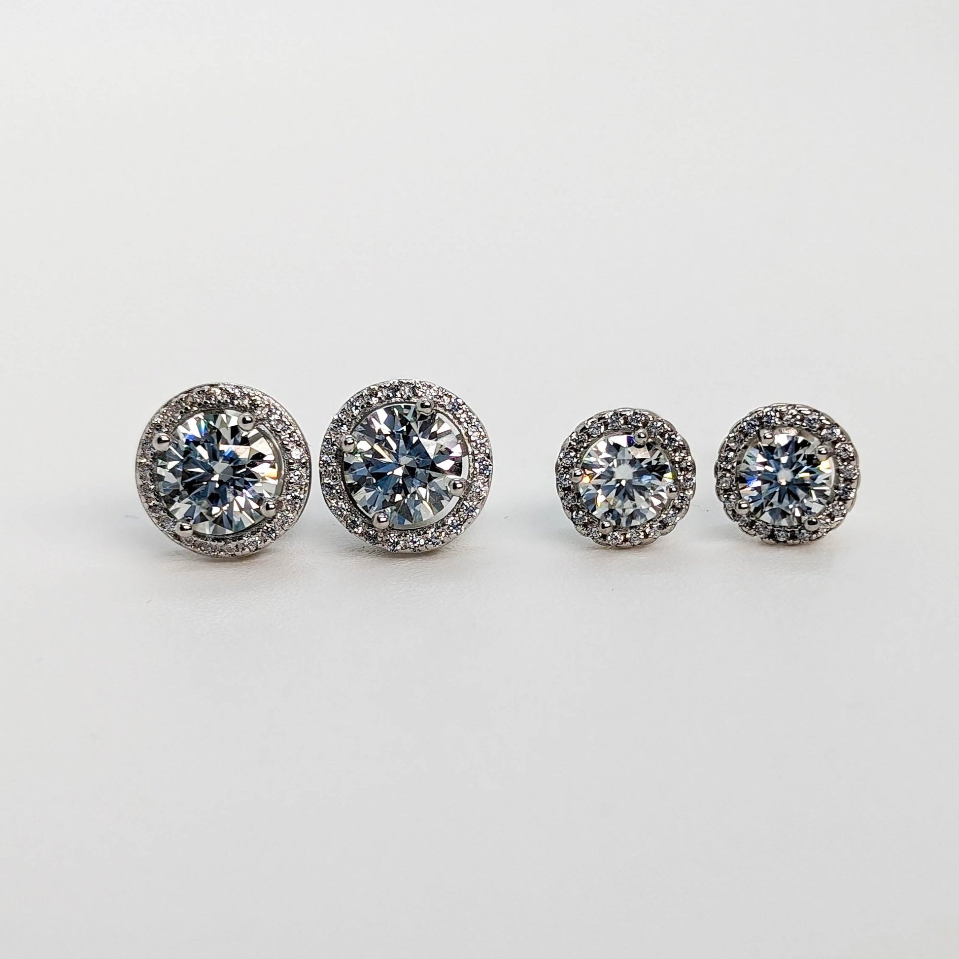 Elevate your elegance with these Radiant Moissanite Halo Stud Earrings. Crafted from 925 sterling silver and plated in white gold, these stunning earrings feature a brilliant round moissanite stone at the center, surrounded by a halo of smaller moissanite gems. With a D color grade and VVS1 clarity, these earrings are designed to sparkle brilliantly in any light.